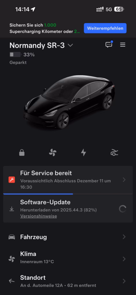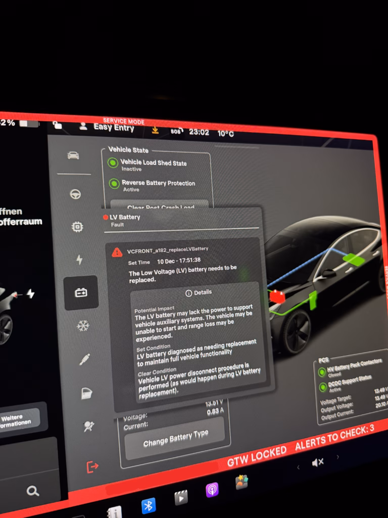 Wisst ihr, wenn es kälter draußen ist – aber trocken – dann fühlt es sich immer sehr erholsam an einfach draußen zu sein. Weniger erholsam ist es, wenn plötzlich die Tesla App euch meldet „Achtung! Batterie defekt! Buchen Sie jetzt einen Servicetermin“. Da fragt man sich ganz fix „Ähhh.. what!?“. Mir fiel schon 1-2 Tage zuvor auf dass etwas nicht stimmte. Mein Auto parkte nicht in der Garage, sondern draußen an der Straße. Wenn ich in die Nähe kam hörte ich, wie die Hochvoltschützen klackten und das ohne Interaktion. Ich schaute in die App und stellte fest, dass mein Auto bereit aufgewacht war. Seltsam, aber ich dachte mir nichts weiter dabei. Im laufe des selben Tages als auch am Tag darauf, beobachte ich wie mein Auto sich eigentlich gar nicht mehr schlafen legte. Auch meine Frau berichtete mir von einem „klacken von deinem Auto“. Ich dachte erst, vielleicht hilft es ja die ausstehenden Updates mal zu installieren, möglicherweise ist das irgendein Bug den ich so bereinigt bekomme. Ich klinkte das Auto also ins WLAN und erhielt dann recht schnell eine Nachricht auf dem Fahrzeugscreen als auch auf dem Smartphone: „Achtung! Batterie defekt! Buchen Sie jetzt einen Servicetermin“.